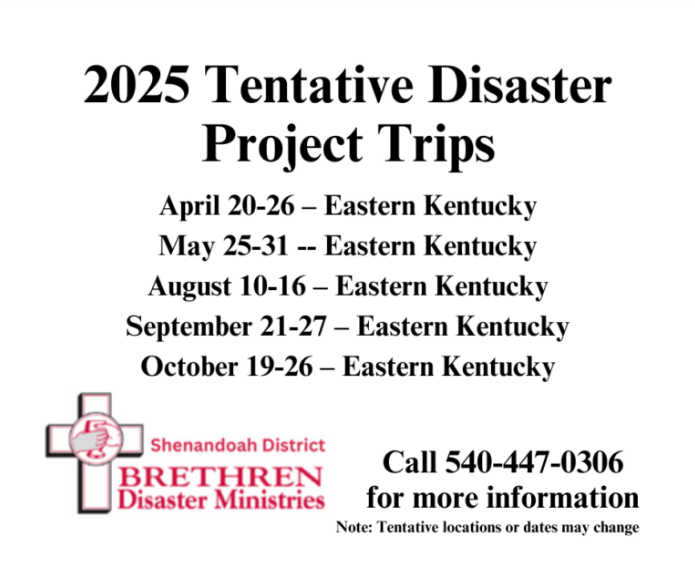 For weeklong trips, all expenses are paid for volunteer crew members, and transportation is provided. The teams generally leave on Sundays, put in a week’s work, and return home on Saturdays. Local, short-term service projects are available in cooperation with local community organizations and are on a case-by-case basis. In addition, proceeds from the annual Shenandoah District Disaster Auction and Sale in May help support this ministry.